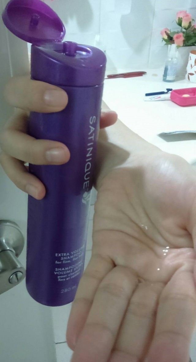 阿盤 2018-03-25 10:02:34 SATINIQUE 豐盈洗髮乳(油性或易扁塌髮質) 心得分享 SATINIQUE 豐盈洗髮乳產品顏色呈透明狀,味道很是很淡的果香味,洗完殘留在頭髮上的只剩非常微微的香味跟使用說明一樣,需要搭配潤髮產品使用,因為洗的過程跟洗完頭髮都是非常不滑順,但算好沖洗。至於產品標榜的輕盈蓬鬆感與柔順光澤,在我身上看到的成效不大。我髮質狀態:細軟、扁塌、不算柔順、頭皮會微出油。