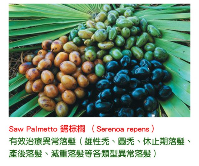 因此鋸棕櫚Saw Palmetto廣泛的應用於治療異常落髮,抑制DHT與5-α還原酶(5-alpha-reductase)。