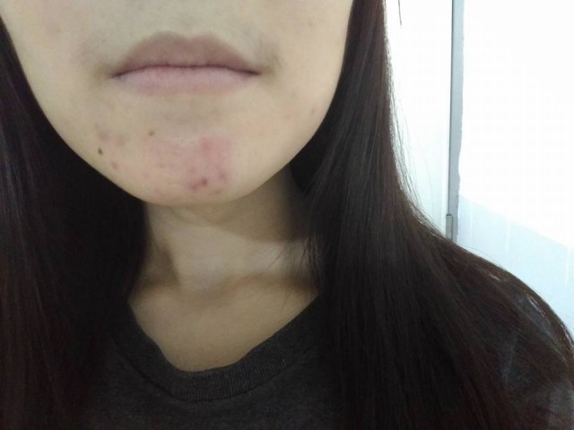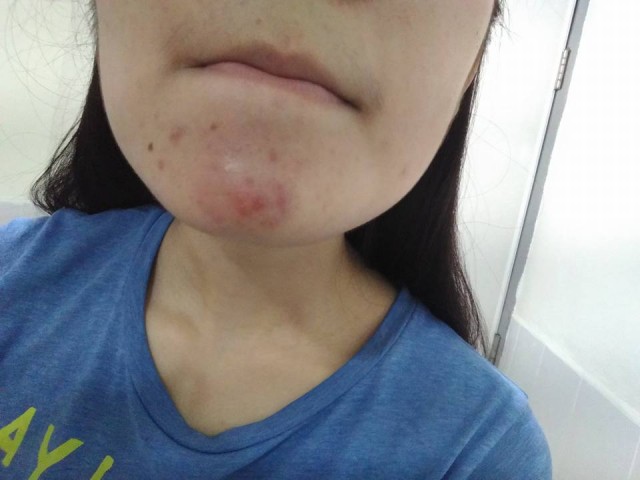 下巴的紅腫痘幾乎都快消了,留下紅紅的痘疤