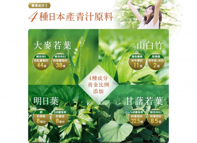 大麥若葉--> 維他命E是紅蘿蔔的44倍 / 維他命B2約高麗菜的38倍