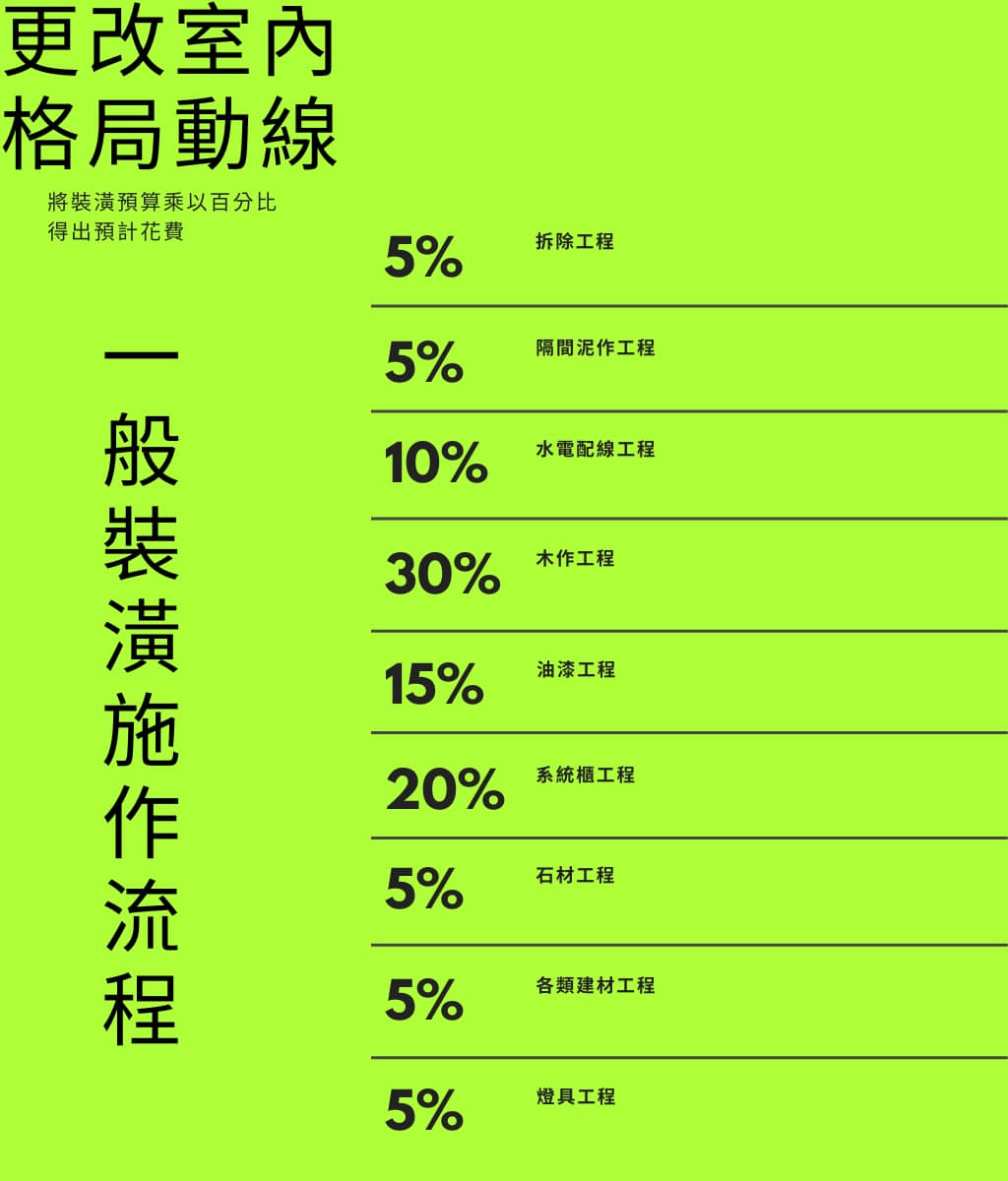 油漆工程 (15%) → 系統櫃工程 (20%) → 石材工程 (5%) → 各類建材工程 (5%) → 燈具工程 (5%)
