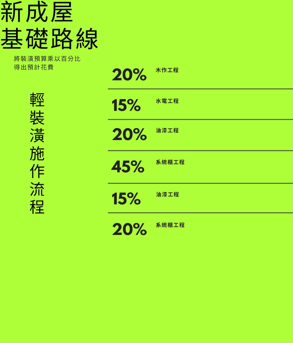 木作工程 (20%) → 水電工程 (15%) → 油漆工程 (20%) → 系統櫃工程 (45%)