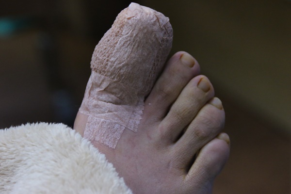後來發現趾甲彎曲變形,雙腳大拇趾的趾甲已經刺進兩旁的甲溝