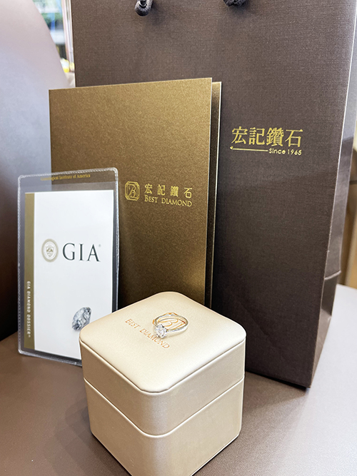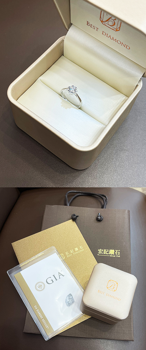 到宏記取件的時候,除了有鑽戒,另外還會附上的是鑽石的GIA證書、宏記鑽石保證書、宏記的專屬戒盒以及提袋一個,很完整!