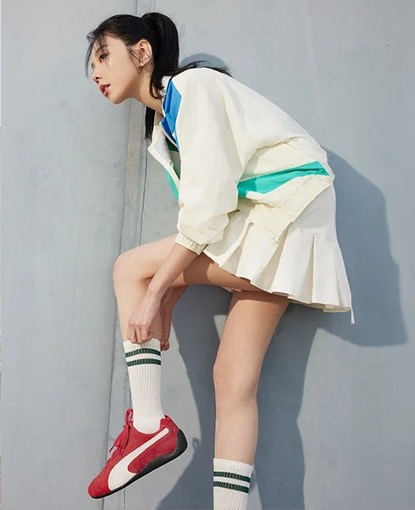 白色運動外套跟百褶短裙,整個一套下來超清爽,而且短裙直接露出大長腿,直接贏在起跑點!