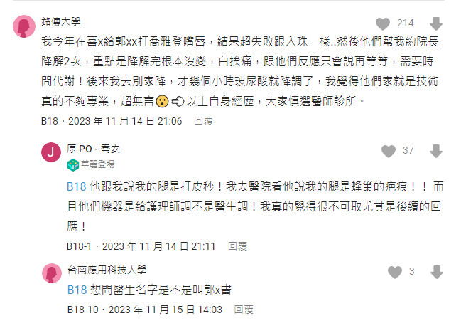 Norma 2025-07-21 19:34:27 請問有人給郭X書醫師打過玻尿酸? 好奇大家有給郭X書醫師做過微整的嗎最近一直在猶豫要不要去打想說可以消除法令紋因為真的很明顯讓我超困擾每次化妝都要遮瑕就在想是不是要直接去打可以不用化妝遮有人也這樣做?不曉得那位醫師技術如何?