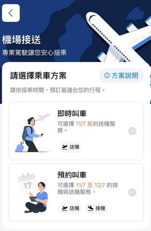 再來點進去會看到即時叫車和預約叫車,就看你要選擇哪一種,但我的話出國都是先提前處理好,所以我都使用預約比較多