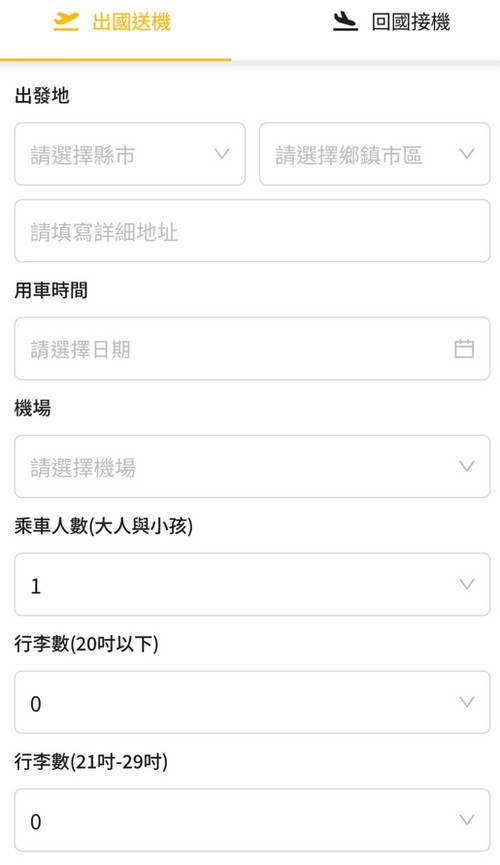 記得最上面有分出國和回國的接送,點選好什麼時候接送後就可以開始填寫基本資料,還有出國的人數和行李數量
