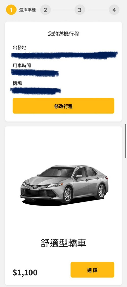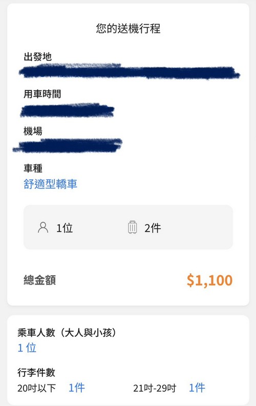 因為我只有一個人加上行李也不多,所以就選舒適型轎車,上面一樣可以再次確認你的出發地、用車時間、航廈,像我從台北到桃園機場費用就是1100元,不用擔心高峰時段會漲價