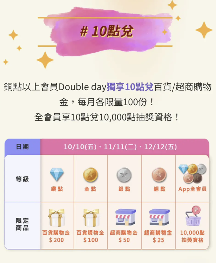 火腿胖胖 2025-11-17 14:27:00 HAPPY GO會員分級週年慶兌最大「10點兌活動」 HAPPY GO會員分級週年慶兌最大「10點兌活動」最後一次兌換時間是12/12鑽點會員可直接以10點換200百貨購物金超划算的~~