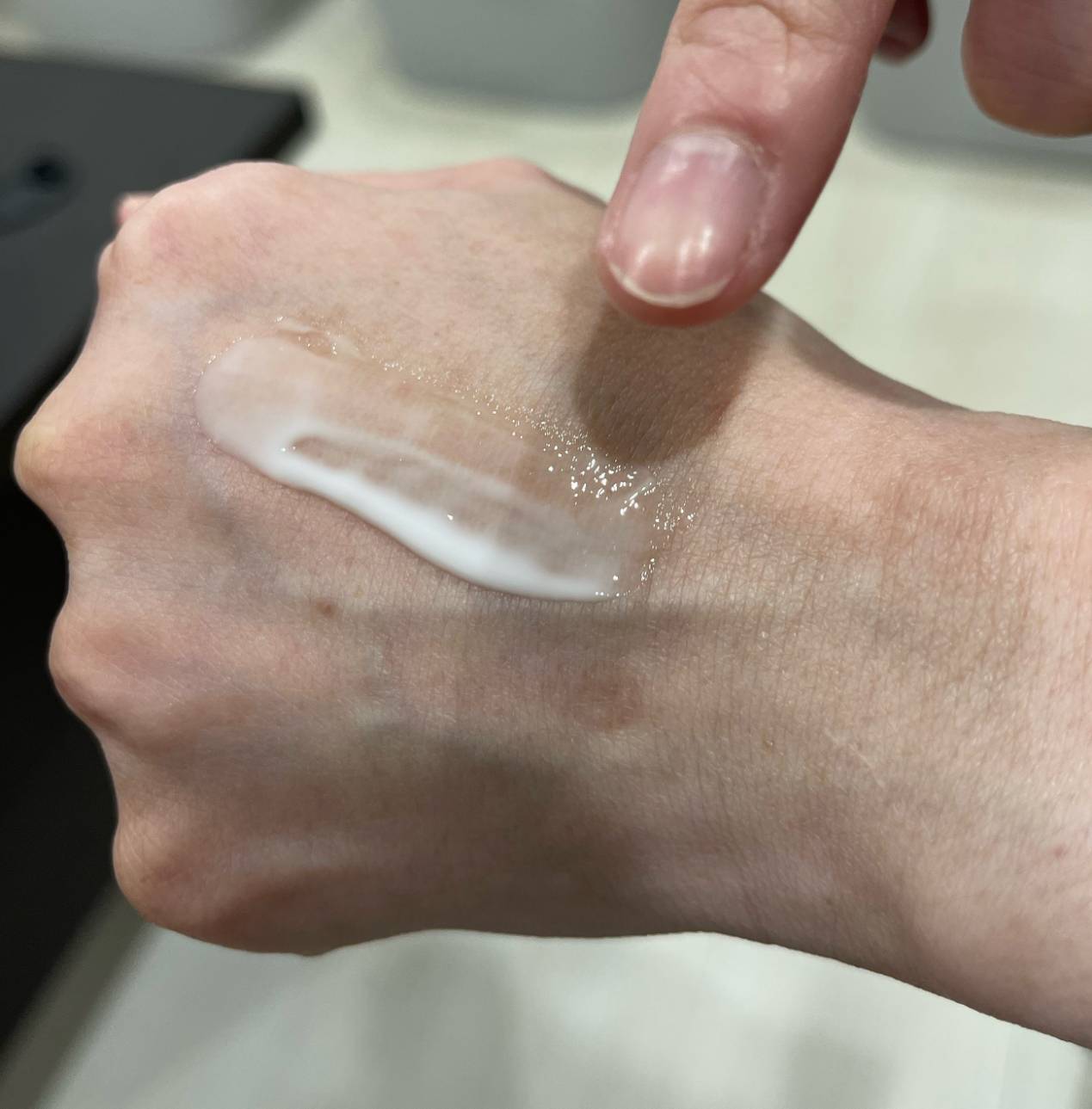我其實超怕乳霜會太厚重,會擔心皮膚更悶。這罐擠出來是乳白色的乳霜,但推開之後非常水感,延展性很好,一點點就可以帶過全臉。